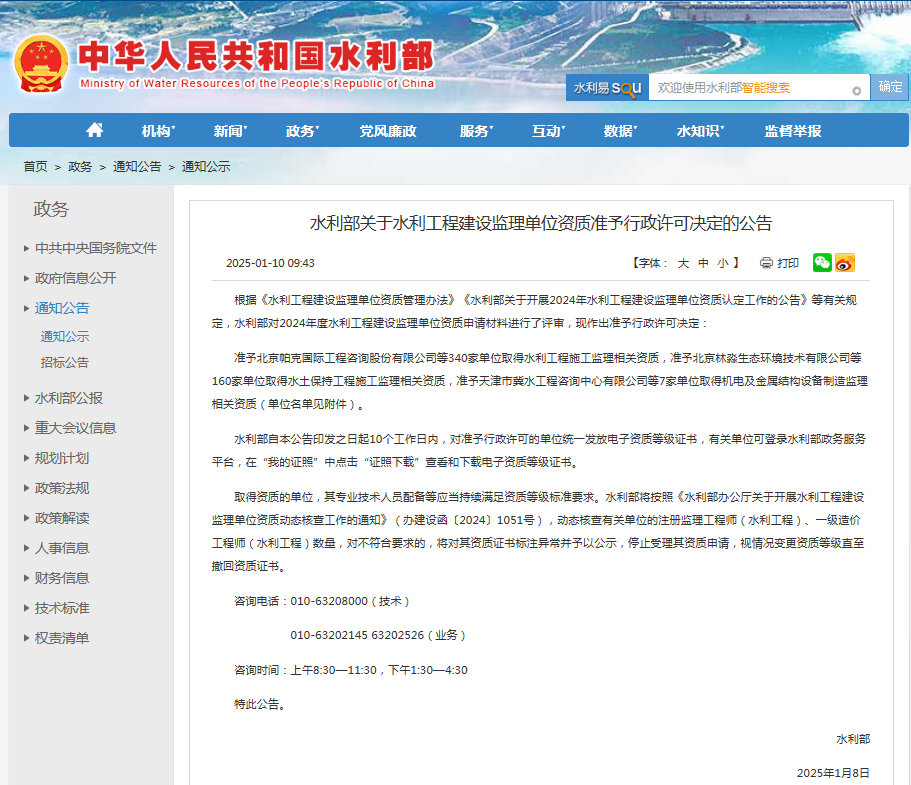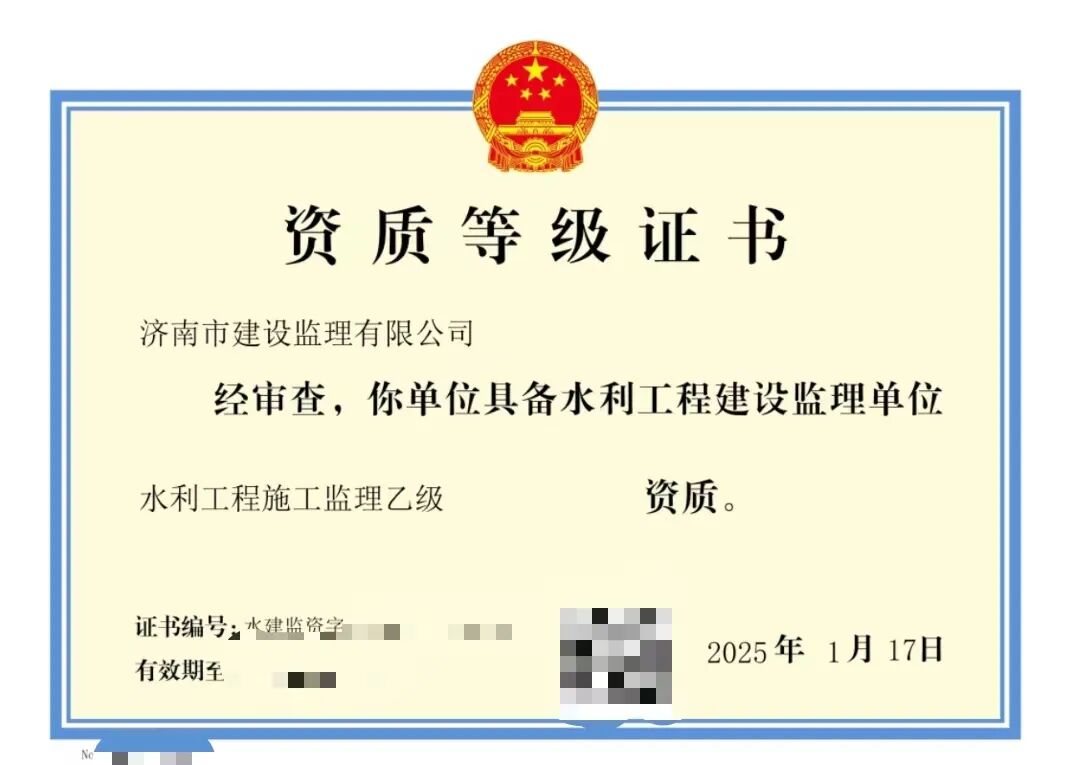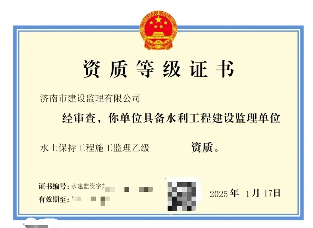 二〇二五年一月,經水利部批準,我公司同時取得水利工程施工監理乙級資質及水土保持工程施工監理乙級資質。這是我公司在取得工程監理綜合資質后,又獲得的住建部管理范疇之外的從業資格,為公司經營業務開辟新的領域,為公司業務類型的拓展提供新的平臺,也為公司持續、快速發展奠定了堅實基礎。
